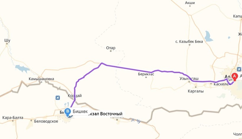 Ниже приведена информация о том, сколько часов вам потребуется, чтобы добраться от Бишкека до Алматы, а также приведена примерная стоимость проезда (средняя цена билета) на том или ином виде транспорта.