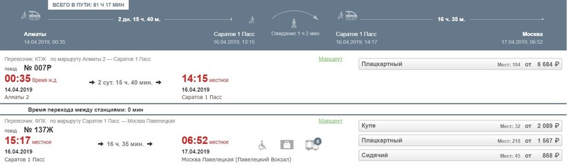 Этот вариант возможен, но вот только прямые поезда из Алматы в Москву не ходят, можно доехать только с пересадкой. Ее сделайте, например, в Саратове.