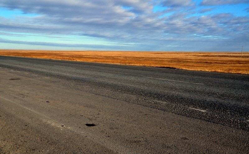 Дорога очень ровная, кое-где встречаются небольшие выбоины, но в целом покрытие довольно хорошее. Так как населенных пунктов в Казахстане немного и встречаются они достаточно редко, поэтому вполне реально разогнаться до скорости 120-130 км/ч. На всем пути есть всего небольшой участок (буквально 1-1,5 км), где асфальтного покрытия нет вовсе.