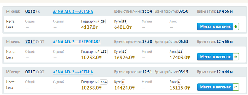 - плацкарт – около 4100 тенге (11 евро);