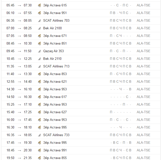 - «Air Astana». В день вылетает несколько самолетов данной авиакомпании. Первый рейс в 06.10, последний – около 20.00;