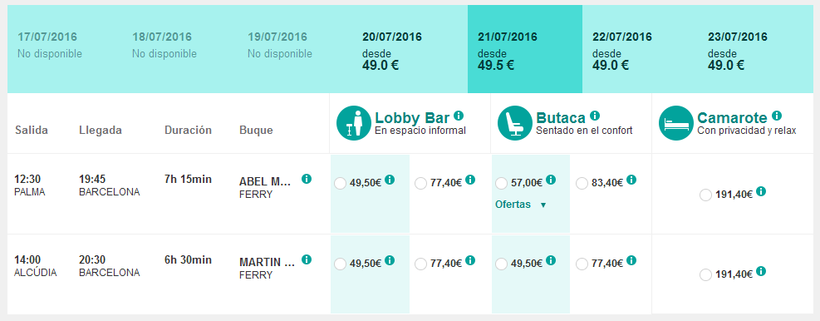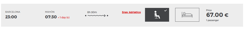Стоимость билетов на паром компании Balearia зависит от категории места и обойдется от 49 евро (сидячее место в общем зале) до 191 евро (за спальное место в каюте).