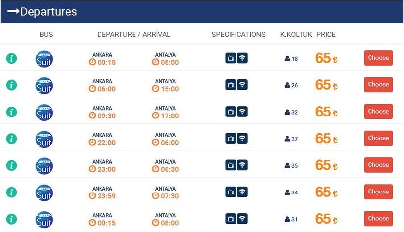 Ниже приведена информация о том, сколько часов вам потребуется, чтобы добраться от Анкары до Анталии, а также приведена примерная стоимость проезда (средняя цена билета) на том или ином виде транспорта.