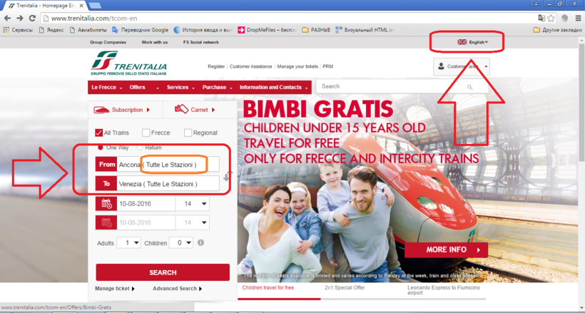 Для этого можно зайти на сайт Трениталия и заказать билет. Я всегда выбираю английский, мне так удобнее. Выбирая место прибытия и отбытия, лучше взять сразу все станции, а не проверять выборочно по одной.