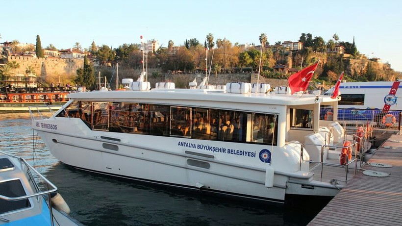 С конца июня и до сентября несколько раз в день от причала Marina Kemer отправляется в Анталию морской автобус. Именно автобус, а не катер) Этот "катер" очень маленький, вмещает 40 пассажиров, которые размещаются внутри как в автобусе. Открытой палубы нет, салон застеклен и только небольшие форточки спасают от духоты. В общем название автобус отлично подходит для этого способа передвижения.