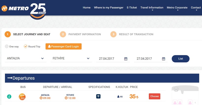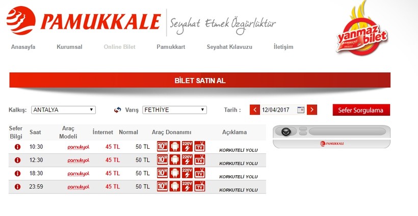 Купить билеты можно на сайтах компаний, обслуживающих маршрут, - Pamukkale, Metro, KamilKoc. Рассчитаться за проезд можно с водителем или предварительно приобрести проездной в кассе автовокзала Антальи.