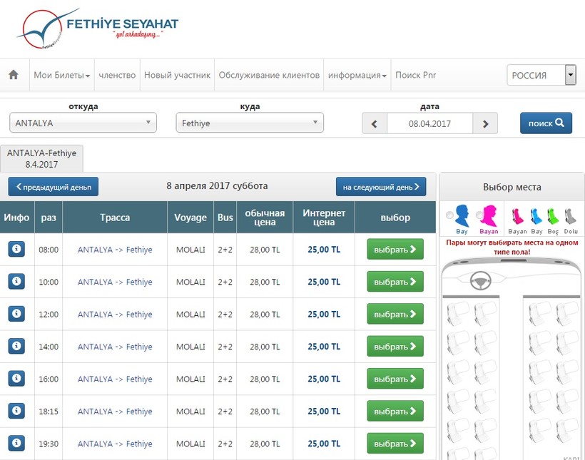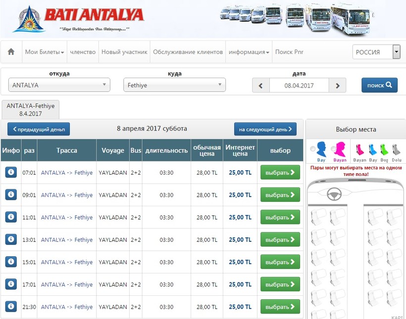 Билеты на автобусы из Анталии в Фетхие можно приобрести в кассах на территории автовокзала или на сайтах компаний: