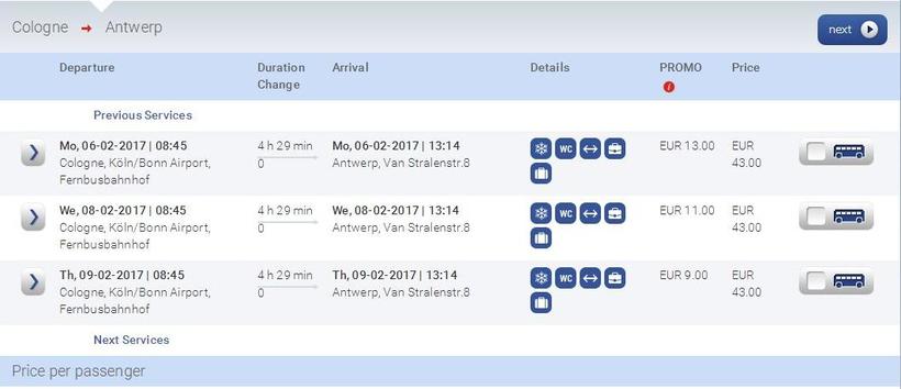 Компания Eurolines – автобусный перевозчик, который совершает прямые рейсы между аэропортом Köln/Bonn и Антверпеном. Для тех, кто прилетает в Кельн, а ночевка запланирована в Бельгии, это будет отличным вариантом. Жалко только, что автобусы ездят не каждый день, а по понедельникам, средам, четвергам и субботам в 08:45. В дороге нужно будет провести 4,5 часа. Салоны у перевозчика удобные, современные, на этом маршруте есть туалет, но нет интернета. В Антверпене остановка находится на Van Stralenstraat 8, рядышком с Главным ЖД вокзалом города.