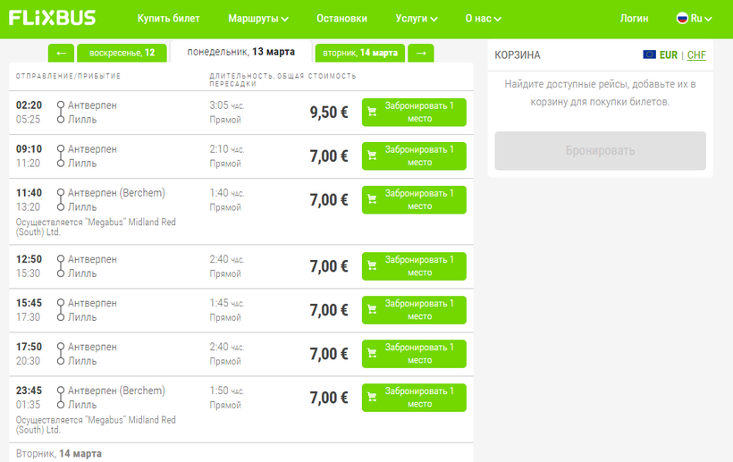 Я приготовил парочку скриншотов, которые помогают убедиться в превосходстве «Flixbus». Обратите внимание на цену, количество рейсов и язык сайта.