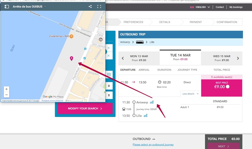 - «Ouibus». Автобусы этой компании ходят в Лилль один раз в день, на дорогу уходит примерно полтора часа. На сайте «Ouibus» можно посмотреть расписание, адреса вокзалов и остановок, но с ним у меня случилась небольшая оказия – антивирус постоянно блокировал всплывающую карту с остановками. Намного полазив на их страничке, я решил, что незачем мучиться и купил билеты у «Flixbus».