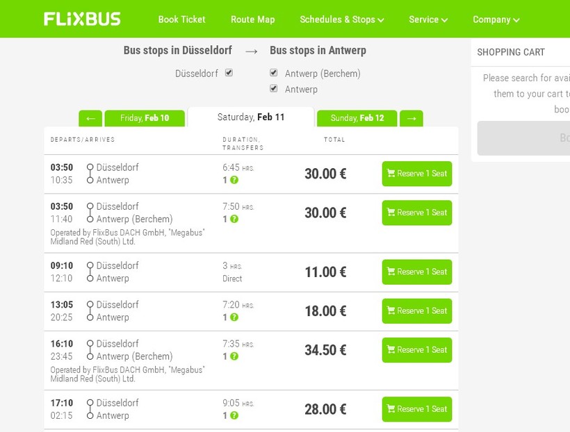Автобусы компании FlixBus по маршруту Düsseldorf ZOB am Hbf - Antwerpen (Koningin Astridplein), осуществляют перевозки без пересадок следующим образом: