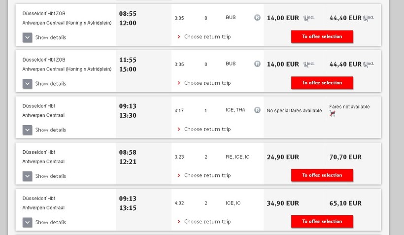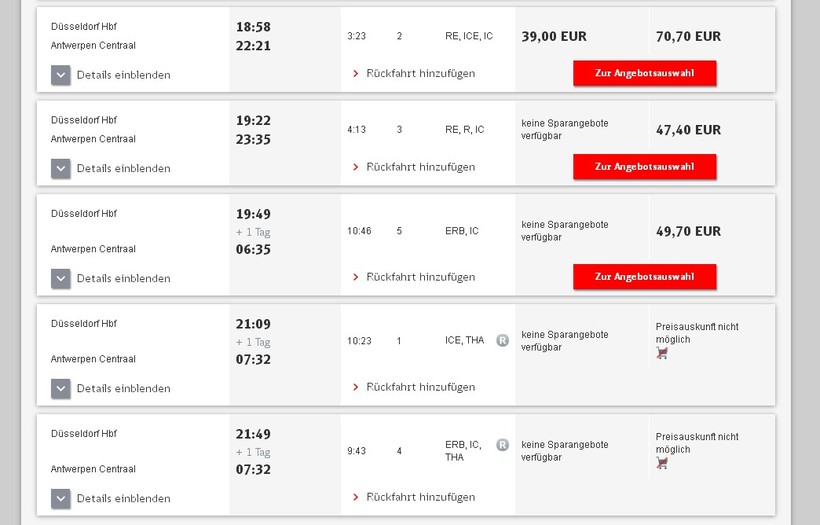 Все поезда отходят от Düsseldorf Hbf, а прибывают на Antwerpen Centraal.