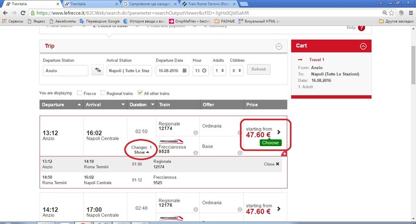 Цена билетов с пересадкой на станции Roma Termini -47,60 евро.
