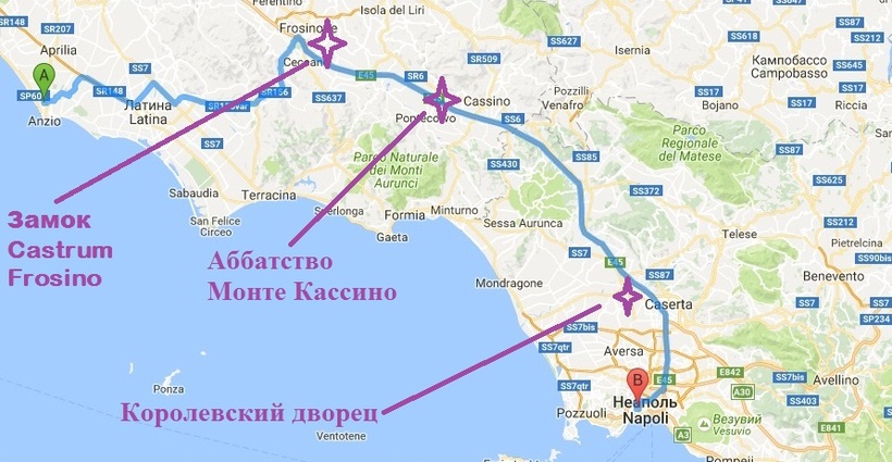 Почти на пол пути в Неаполь в городе Кассино есть действующий монастырь - Аббатство Монте Кассино. Основанный в 529 году, это один из самых древних монастырей в Европе. Удивительно, но после полного уничтожения монастыря во время войны в 1944 году, его полностью восстановили по старинным чертежам. Воспроизвели даже древние мозаики.