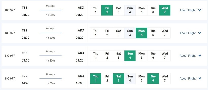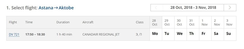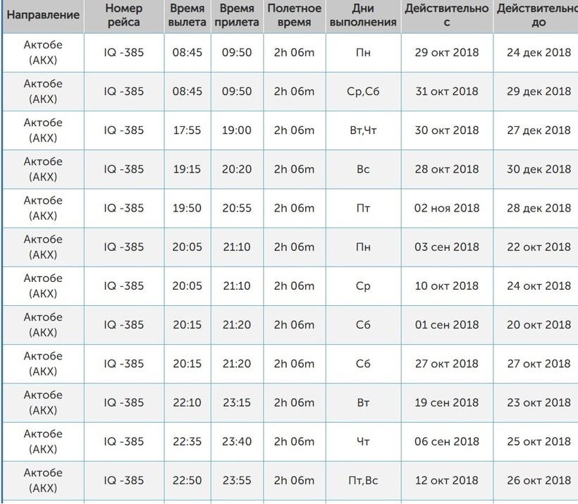 Первый от компании Air Astana. Рейс выполняется ежедневно, только в разные дни в разное время. По вторникам, четвергам и субботам вылет из Международного аэропорта Астаны в 14:40, а посадка в 15:30 в аэропорту Актобе. В остальные дни вылет в 08:30, а посадка в 09:20. Время в полете составляет 1 час 50 минут.