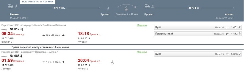К сожалению, прямые поезда из Бишкека в Астану не курсируют. Можно добраться только с пересадкой. Ее рекомендую сделать на станции «Луговая» (она находится на границе с Казахстаном). Так просто будет быстрее всего, и на дорогу вы потратите примерно 1,5 суток.