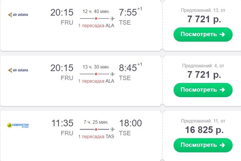 Билеты до Астаны от 8180 сомов (это примерно 44200 тенге или 7700 рублей).