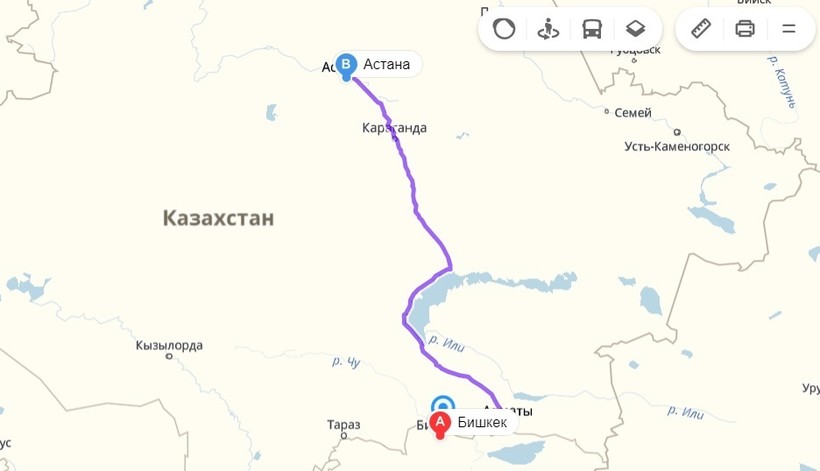 Бишкек — Нур-Султан (Астана) — маршрут на карте