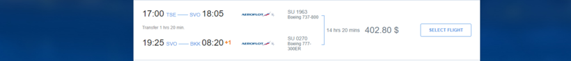 - 10-ти часовой – понедельник, среда, четверг, пятница, суббота. Самолет улетает в 21:30, прибывая в 23:10 в Алматы, а уже оттуда в 01:10 отправляется в Бангкок;