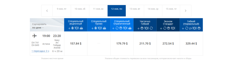 В среду, пятницу и воскресенье в 7:00 вылетает 7-и часовой рейс с одной пересадкой. Происходит она в городе Алматы и уже в 10:25 самолет отлетает в Баку. Разница времени – Алматы/Баку: - 2 часа.