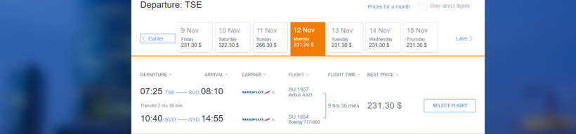 Также по времени вам может подойти 10-ти часовой перелет с одной пересадкой! Каждый день в 7:25 в Шереметьево вылетает самолет, а в 10:40 из этого же аэропорта вылетает рейс в Баку. Опять же не стоит забывать разницу времени (Астана/Москва: -3 часа, Москва/Баку: -1 час).