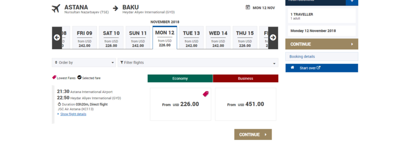 Вариант с одной пересадкой предлагает компания Scat Airlines. Ежедневно в 19:00 из аэропорта Астана вылетает самолет. В 20:30 прилетает в город Актау. И уже в 23:30 вылетает в Баку. Хотелось бы добавить, что разница времени между Актау и Баку: -1 часа, поэтому прилетает самолет тоже в 23:20. Время в пути – 6 часов 20 минут.