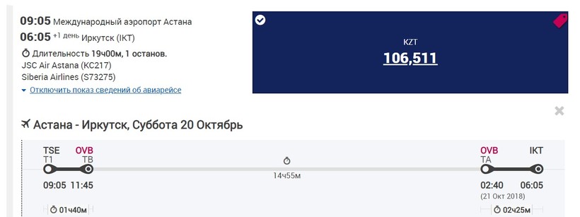 Есть один вариант с пересадкой в Новосибирске. Лететь на несколько часов дольше, а по цене примерно также. Вылет из аэропорта Нурсултан Назарбаев в 09:05, затем пересадка в Толмачево (придется ждать с 11:45 до 02:40). Посадка в аэропорту Иркутска в 06:05. Рейс в Новосибирск выполняет компания «Эир Астана», а в Иркутск S7. Этот вариант актуален по вторникам, четвергам и субботам.