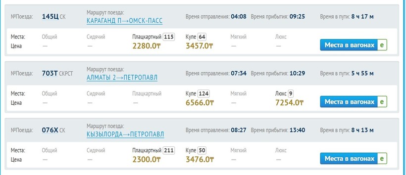 Поездка в плацкартном вагоне до Петропавловска обойдется в 450 рублей, а в вагоне купе в 750 рублей. Поездка из Петропавловска в Иркутск обойдется в 4000 за плацкарт и 6800 за купе.