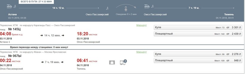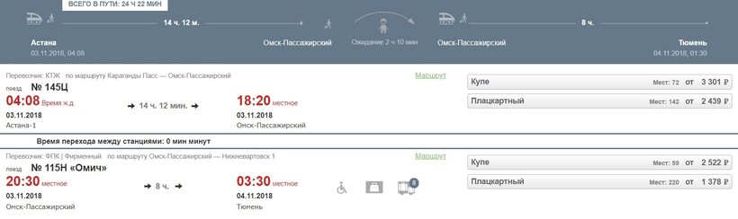 Прямого поезда нет, так что мне пришлось делать пересадку в Омске. Меня такой вариант вполне устроил. Второй важный нюанс, который нужно запомнить, что поезд до Омска ездит только по средам, субботам и понедельникам. Отправление со станции Астана-1 в 04:08, а прибытие на Омск-Пассажирский в 18:20. Этот поезд едет чуть больше 14 часов. Далее из Омска есть поезд, который отправляется в 00:22, на него я и купил билет, он ежедневный. Прибытие на вокзал в Тюмень в 06:41. Ехать этим поездом чуть больше 7 часов.