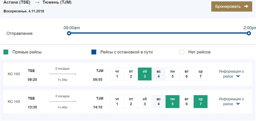 Вылет из Международного аэропорта Астаны по понедельникам и средам в 13:30, а посадка в аэропорту Рощино в 14:10. Время перелета 1 час 40. По субботам вылет в 09:20, а посадка в 09:55. Лететь 1 час 35 минут. Оба рейса выполняет компания «Эйр Астана».