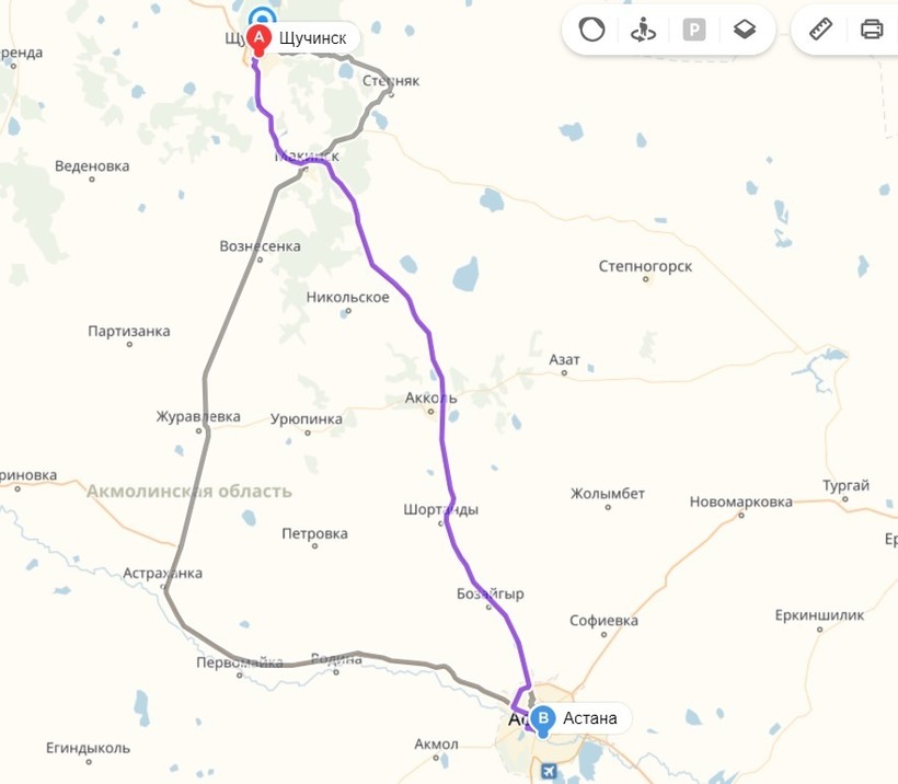 Нур-Султан (Астана) — Щучинск — маршрут на карте