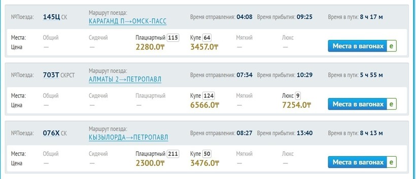 - купе в Петропавловск — 3400-6600 тенге (600-1200 рублей);