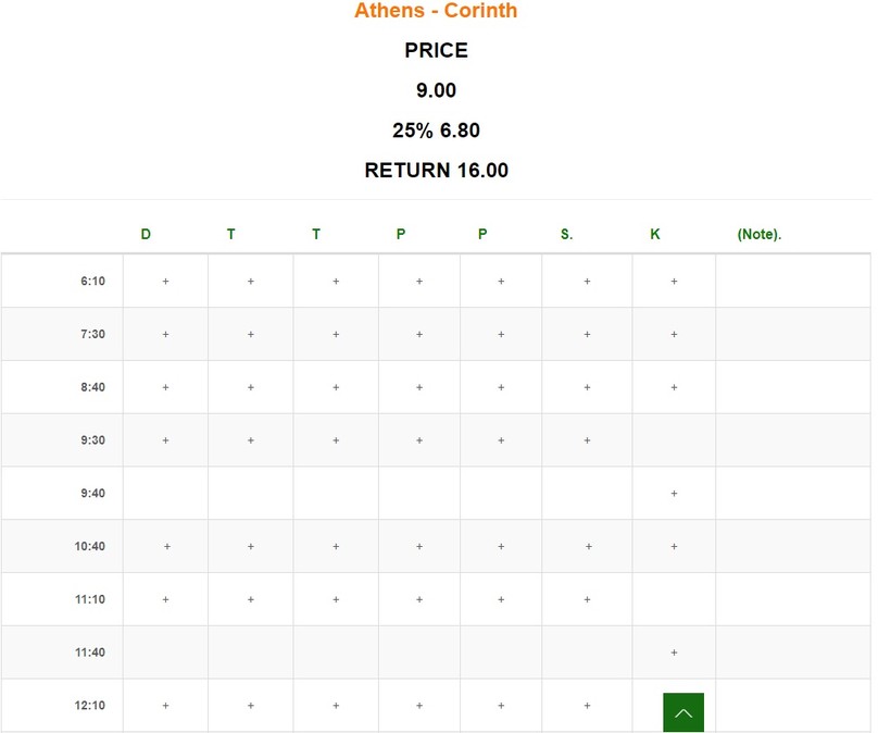 Ниже приведена информация о том, сколько часов вам потребуется, чтобы добраться от Афин до Коринфа, а также приведена примерная стоимость проезда (средняя цена билета) на том или ином виде транспорта.