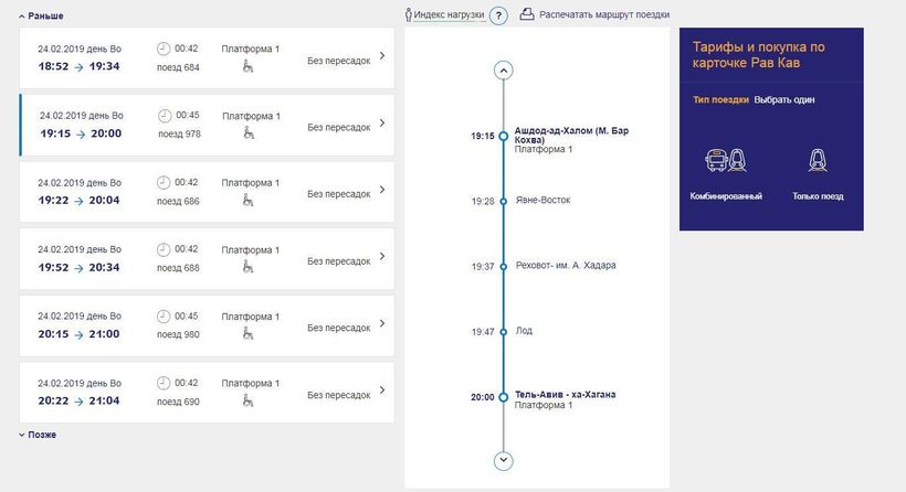Отсюда можно уехать на прямом поезде в Тель-Авив. Вот часть расписания поездов с официального сайта израильских железных дорог: