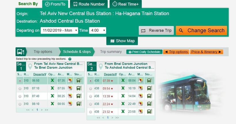 Проблема заключается в необходимости делать пересадку с автобуса № 310 на автобус № 438. Я привел пример с пересадкой в Бней Даром (так как он самый дешевый), но сайт Egged предоставляет и другие варианты, тоже с как минимум одной пересадкой. Это доставляет некоторые неудобства, но смириться можно — ждать на остановке обычно приходится не более 5 минут. Вся поездка в целом, с учетом времени на пересадку, займет около часа. С пересадками есть еще один нюанс — остановки объявляет водитель, или они выводятся на табло, но в любом случае это делают на иврите и арабском. Поэтому лучше заранее посмотреть остановки по выбранному маршруту на сайте компании, дабы не попасть впросак, или попросить соседа подсказать, где выходить (английский израильтяне обычно знают).