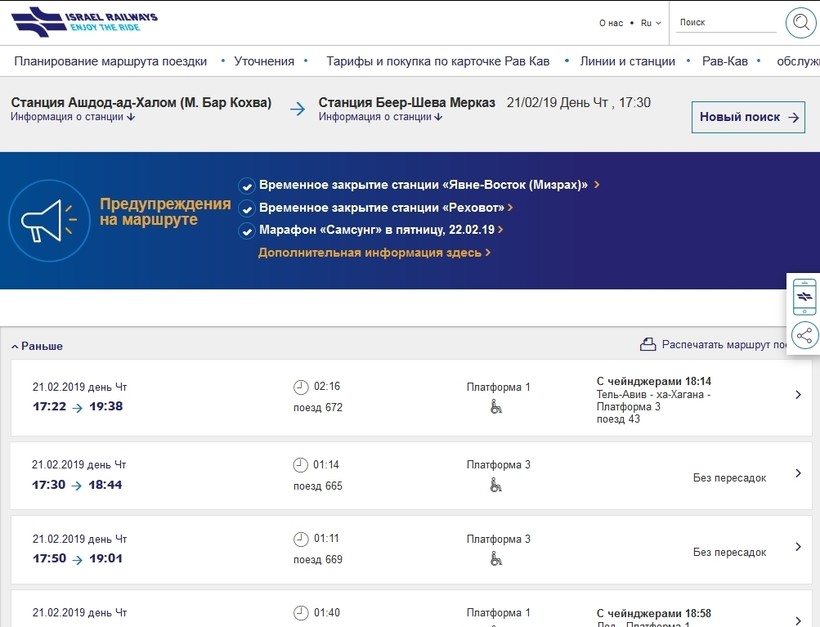 Билеты можно приобрести в кассе вокзала, в автомате на вокзале. Или онлайн на сайте Израильских железных дорог, если у вас есть карта Рав Кав (ее можно купить в кассе).
