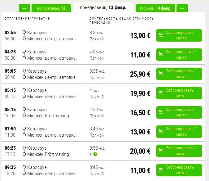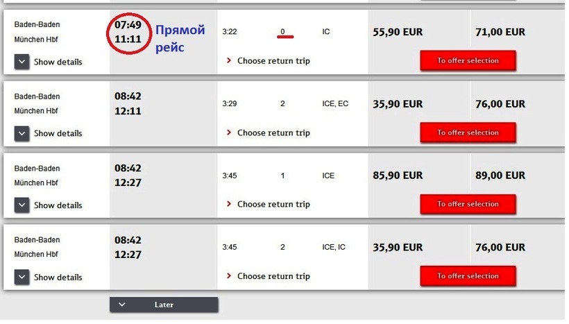 Однако среди множества рейсов, на данный момент, беспересадочный лишь один. Он отправляется из Баден-Бадена в 7.49 утра и через 3 часа 20 минут в начале двенадцатого прибывает в Мюнхен. Однако стоит отметить, что этот рейс не является ежедневным. В зависимости от сезона рейсов может не быть по субботам и воскресеньям, или например, только по воскресеньям. Информацию следует уточнять на сайте.