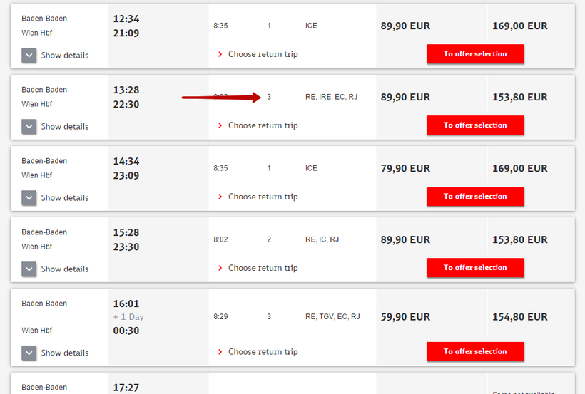 К слову, доехать из Баден-Бадена в Вену можно не только через Франкфурт, также ходят поезда через Мюнхен, но и это ещё не всё. Можно составить вообще маршрут с двумя – тремя пересадками, который занимает столько же времени, вопрос только в том, нужно ли оно вам – делать три пересадки вместо одной? Хотя иногда так можно существенно сэкономить. В любом случае, нужно обязательно пользоваться официальным сайтом железных дорог Германии, там очень удобно расписаны варианты пути из одного города в другой.