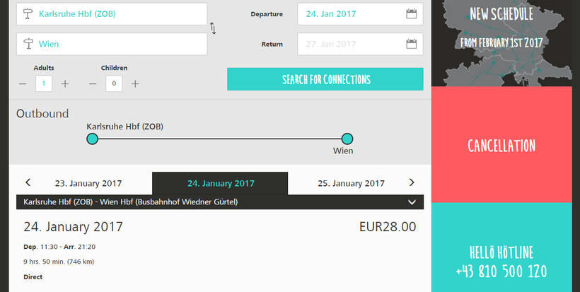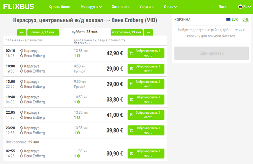 Поезду есть альтернатива в виде автобуса, а насколько эта замена достойная решать уже вам. Автобус намного дешевле, но значительно медленнее. Кроме того из самого Баден-Бадена в Вену напрямую не доехать. Ближайшие автобусы идут туда из города Карлсруэ. До Карлсруэ проще всего добраться на электричке с ЖД вокзала Баден-Бадена, они ходят каждые час – полчаса, на дорогу уйдёт минут 20, подробное расписание можно посмотреть на сайте немецких железнодорожников. От ЖД вокзала Карлсруэ в Вену можно доехать на автобусах двух фирм – «Flixbus» и «Hello». Дорога до Вены занимает почти 10 часов, так что, если решили ехать автобусом, то приготовьте свою попу к длительному сидению в кресле. Конечно автобусы у «Flixbus» и «Hello» комфортабельные с мягкими сиденьями и туалетом в салоне, но 10 часов, это всё равно не шутки. Автобусы «Flixbus» приезжают на вокзал Vienna Erdberg (VIB), он находится далековато от центра, а автобусы «Hello» прибывают к центральному ЖД вокзалу Вены, что намного удобнее. Посмотреть подробное расписание можно на официальных сайтах компаний, вот тут – «Flixbus» и здесь – «Hello».