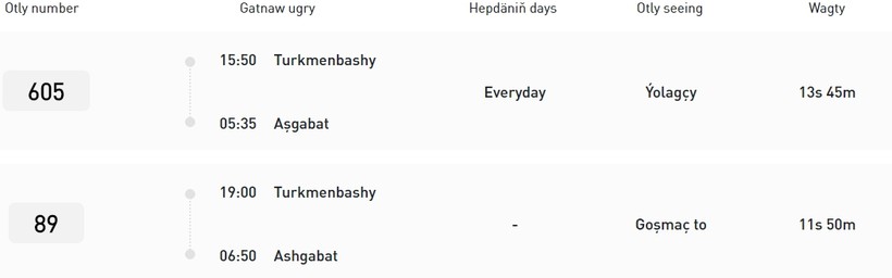 У меня еще есть одно правило — всегда ищу альтернативные варианты проезда, чтобы перестраховаться. Вот, например, авиаперелеты доступны каждый день, да и рейс там один. А вдруг надо срочно добраться в Ашхабад, а билетов на самолет не достать? Поэтому вот вам еще один вариант — паром плюс поезд.