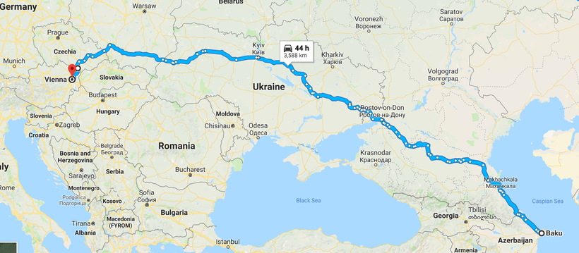 Для того, чтобы из Баку добраться до Вены, надо будет проехать границу с пятью государствами, такими как Россия, Украина, Польша, Чехия и Вена.