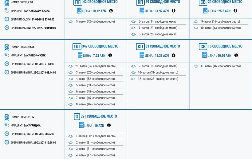 Билеты на поезд от 7,63 манатов (от 296 рублей).