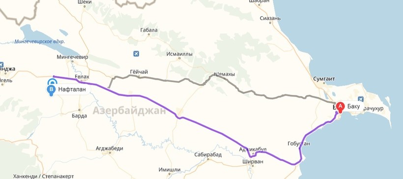 Дорога займет от трех часов и семнадцати минут. От данной станции можно доехать до Нафталана на такси или микроавтобусах, которые отправляются по мере заполнения и обойдутся дешевле, чем такси. Проезд на автобусе — 4 маната (это примерно 155 рублей), а на такси — 10 манатов (это около 388 рублей).