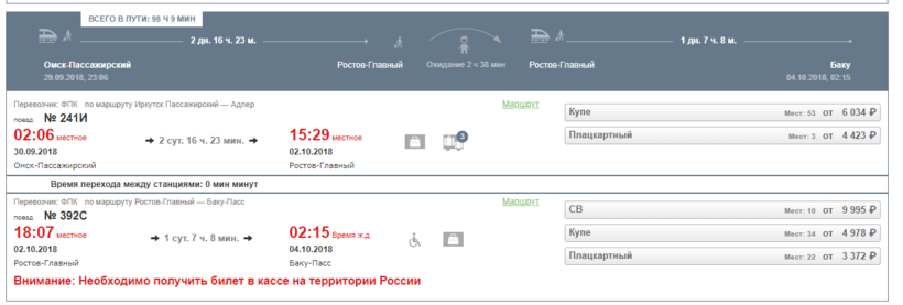 Отправление с вокзала Омска-Главный в начале третьего дня, а прибытие на станцию Волгоград-1 в 16.00 спустя два дня в пути. Этот поезд ездит по нечетным числам. Далее нужно подождать примерно пять часов и пересесть на поезд в Баку. Отправление с этого же вокзала ближе к десяти вечера, а прибытие на Баку-Пассажирский в четыре утра спустя один день и пять часов в пути.