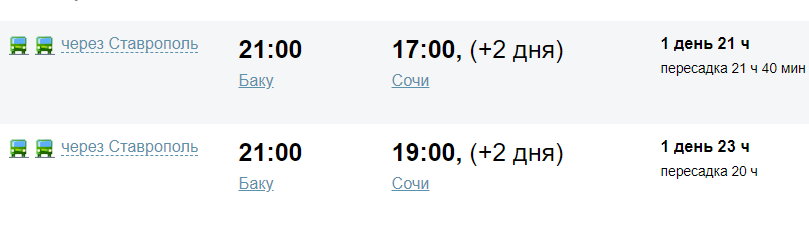 Прямых автобусных рейсов из Баку в Сочи тоже нет. Единственный вариант — ехать на автобусе с пересадкой в Ставрополе. Все рейсы отправляются ежедневно с Бакинского международного автовокзала в 21:00.
