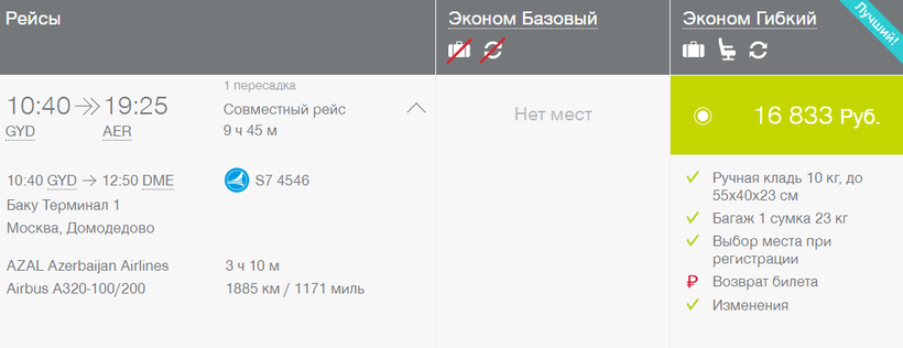 Также можно полететь самолетами компаний S7 Airlines и Azerbaijan Airlines за 16833 руб. Это ежедневный рейс с пересадкой, займет он 9 ч. 45 мин. Пересадка в «Домодедово» и прилет в сочинский аэропорт. Дополнительную информацию можно посмотреть тут.