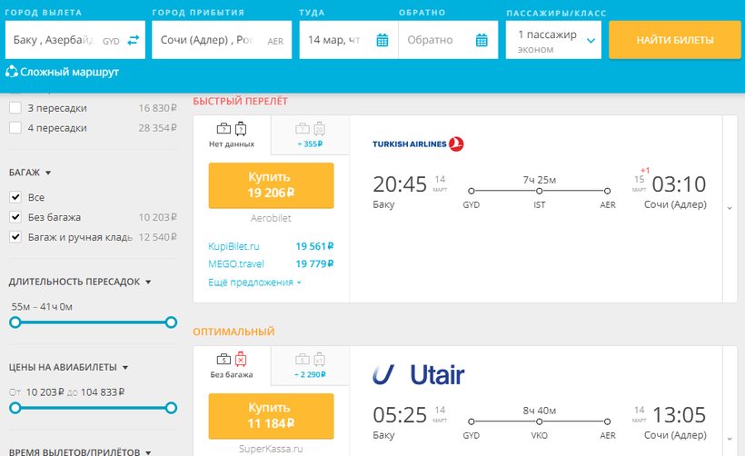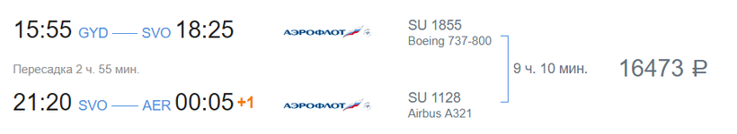 Стоимость авиабилета Баку — Сочи на одного пассажира в эконом-классе начинается от 16 473 руб., если лететь с авиакомпанией «Аэрофлот». Общее время рейса составляет 9 ч. 10 мин. Пересадка 2 часа 55 минут в московском аэропорту «Шереметьево» и прилет в «Международный аэропорт Сочи».