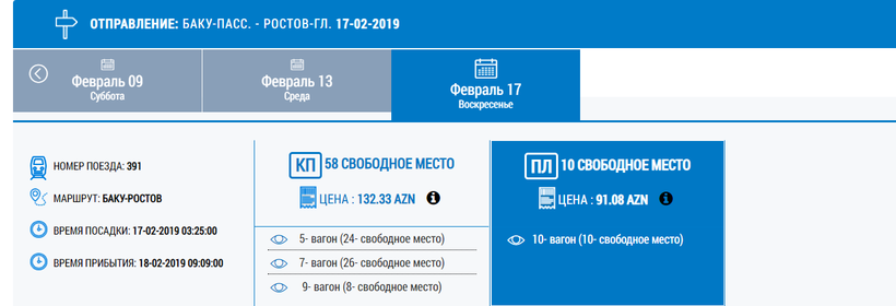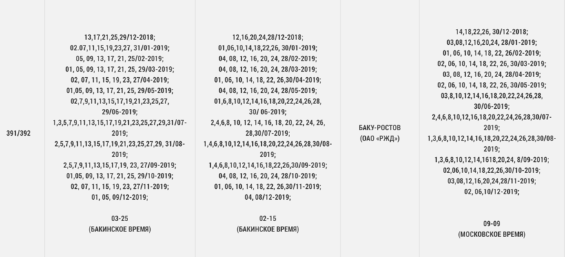 Ниже представлено расписание движения поезда из Баку в Ростов.