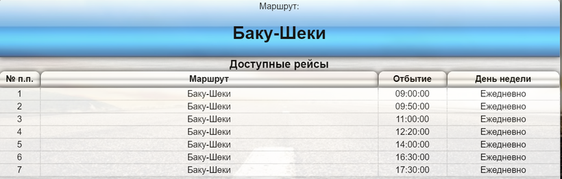 Рейсы из Баку в Шеки совершаются ежедневно. Автобусы отправляются с главного Бакинского автобусного вокзала с часовым интервалом. Первый рейс совершается в 9 часов утра, а последний — в 5 вечера. В пути транспорт находится шесть с половиной часов. Во время движения автобус делает несколько остановок в населенных пунктах.