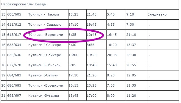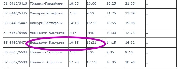 Для того, чтобы пересесть на поезд до Бакуриани, вам нужен поезд, отправляющийся в Боржоми в 6:35. Поезда в Грузии вполне комфортабельные и чистые, сиденья мягкие, кондиционер - как повезет. Поезд идет до Боржоми четыре часа.